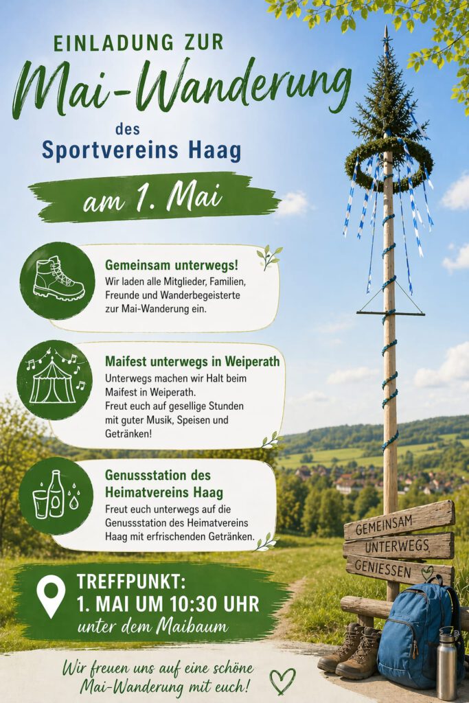 Der Sportverein Haag veranstaltet am 1. Mai eine gemeinsame Mai-Wanderung. Eingeladen sind Mitglieder, Familien, Freunde sowie alle Wanderinteressierten.